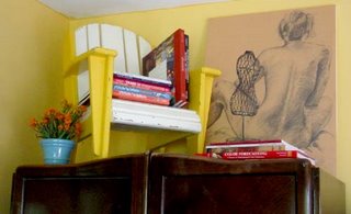 This little adirondack chair was my oldest son’s when he was a tot. I couldn’t bear to get rid of it so it has become a little book shelf. The pencil sketch is mine from a figure drawing class I took waaaay back in art school.