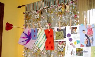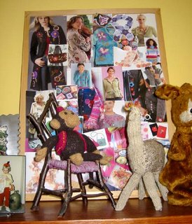 This board is full of “swipes” of my favorite felty inspiration. I bring it when I teach my workshops to help spark ideas. See the little twig chair with the monkey on it? That chair is one of my favorite things. My talented sister-in-law, Christy, MADE IT for me. Oh yeah, I knit that monkey, but he is NOTHING without his chair.