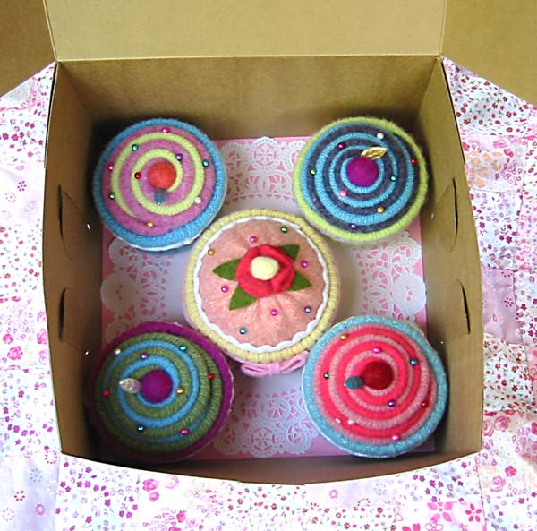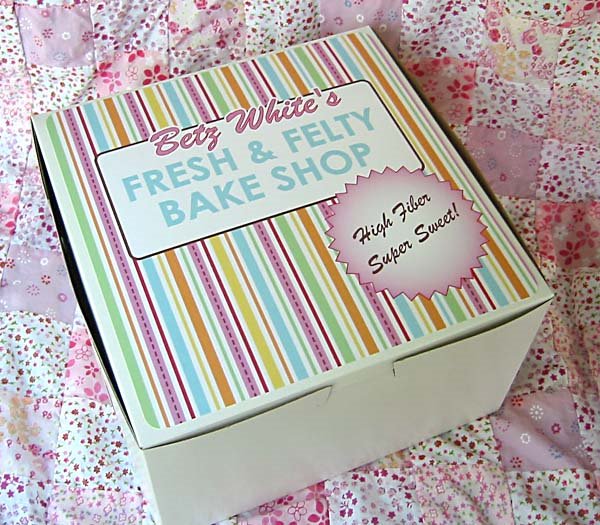 I’ve been trying to come up with creative ways to do a some PR packaging. I’m all about cheap and cheerful! I thought this bakery style cake box would make a nice little presentation for my felty cupcakes. It was a bit ho-hum, so I spiffed it up with some perky graphics.