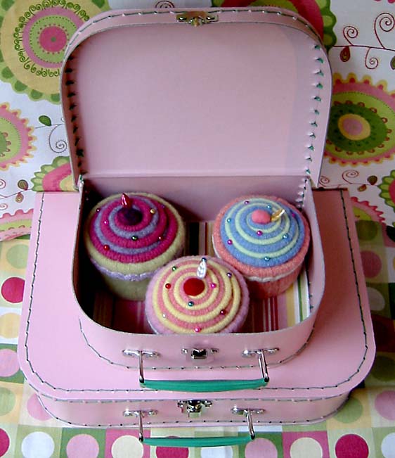 I love the cupcakes. The bakery box fits the theme very well, I think better than the suitcases, although the latter look more sturdy. I wish I had the time, patience and talent to do these. đ