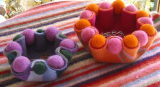 These little bowls are made from recycled wool sweaters bonded to wool felt. Attaching the balls draws up the edges and makes that cute little pie crust effect. Oh boy, here I go again with the food references. Must be all of the cherry pie I ate last weekend in Door County!