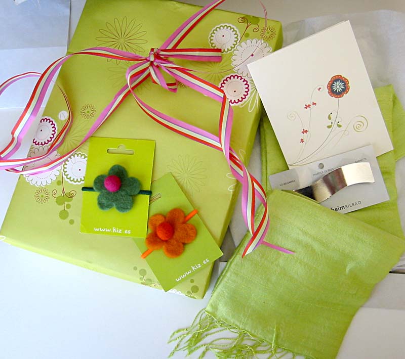 My brother and sister-in-law were traveling in Spain on vacation and picked out some beautiful gifts for me. A silk chartreuse (not charmeuse) scarf with fringe, a silver barette, and two felty deedle-bobbers! My sister-in-law is the best wrapper-upper, too. True to form the packaging is almost as beautiful as the gift.
