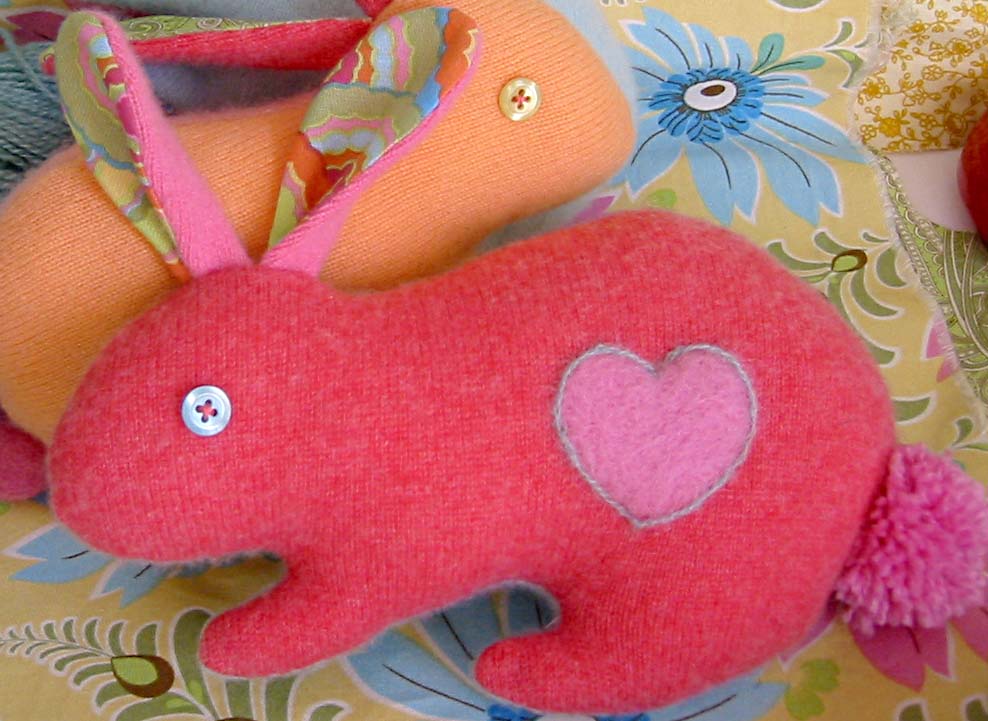 To enter, just comment on this post sometime this week. On Saturday, May 5th, I will do a random drawing of names from the comments. The winner will receive this cashmere bunny…free to a good home! (please make sure I have a way of contacting you either by linking back to your blog/website or by your email address.) If you don’t remember the bunny from my earlier post, it is made from recycled cashmere sweaters. It is coral on one side, aqua on the other, with a heart needle felted on each side. If you’re not the lucky winner, feel free to make your own!