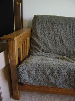 …the schlumpy futon couch. It has been a good friend. It’s now my new roomate in the studio. 1% of the time, house guests will sleep on it. 99% of the time I will stare at it and try to resist stacking stuff on it. I mean, it is a horizontal surface, after all. It used to reside in our family room but I want to leave those days behind. I need to integrate it into my studio space. That and the big blank white wall behind it. But that’s another design dilemma.