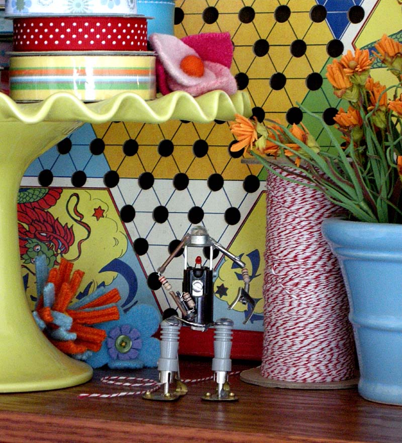 The shelf above my computer. That little robot guy was made by my son and husband. I handle the fabric crafts, the dad handles hot glue and “parts”.