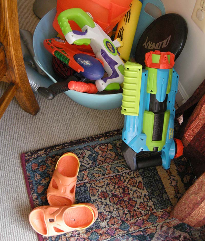 There’s a heap of “outdoor toys” by the back door as they head to the park…