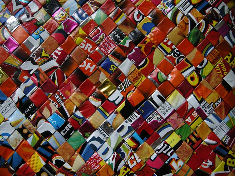 This bag was a gift for my birthday from my brother. Its made entirely of wrappers…looks like potato chip bags and candy wrappers mostly. I’ve seen these sold by companies like Uncommon Goods and Viva Terra. Often times these types of bags are made in other countries by women’s collectives with fair trade practices.