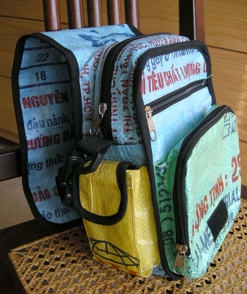 Here’s my newest purchase, made out of recycled rice bags. I actually bought this when I was in Sheboygan teaching people how to make bags out of recycled things. I know, I’m screwy. 🙂 But this is so cool! It’s got many pockets and it’s SUPER light weight and durable. You’ve probably seen totes before made of rice bags, but this was the first purse type bag I’d seen. I love it!