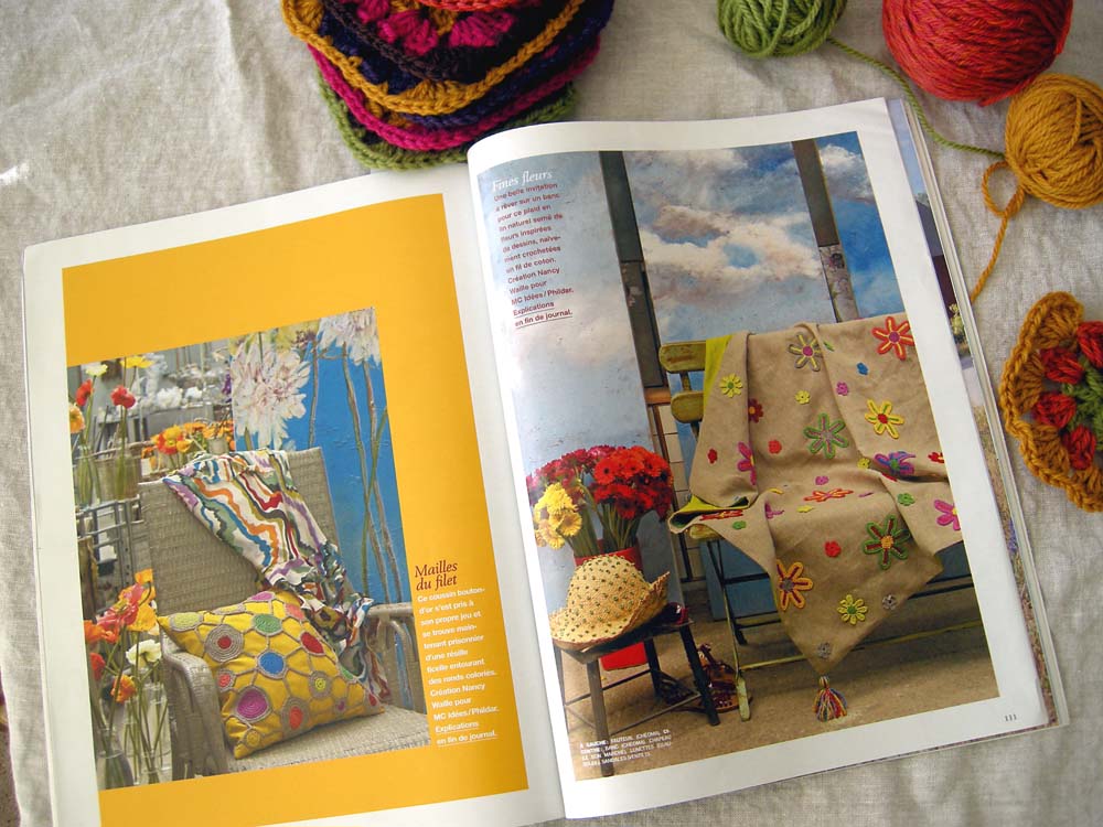 Recently I was looking at the granny squares I had started over the summer. I’m still learning crochet and realizing that my squares are coming out different sizes. Hmmm. I’m trying to decide what to do with them. I could connect them and make a scarf. I was also thinking about a pillow cover or a throw. I’ll never have the patience to make a whole project just out of squares, so I laid them out on a piece of linen fabric as a background. I got the idea from a summer issue of my fave mag Marie Claire Idees. See the blanket on the right below?