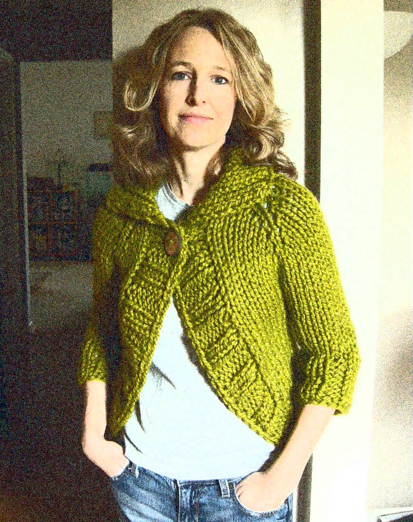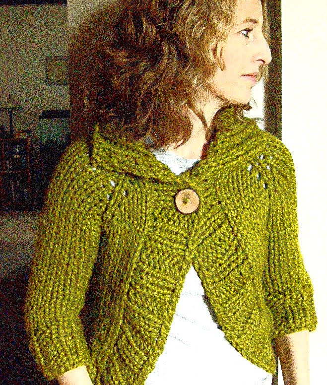 I recently finished knitting this sweater by Jane Richmond called the Cozy Bolero. I used Lion Brand Wool-Ease Thick & Quick yarn. I love this green…it’s kind of a bright pea soup color. The sweater was a fast knit: big needles and big yarn! You know how much I love big fat yarn.