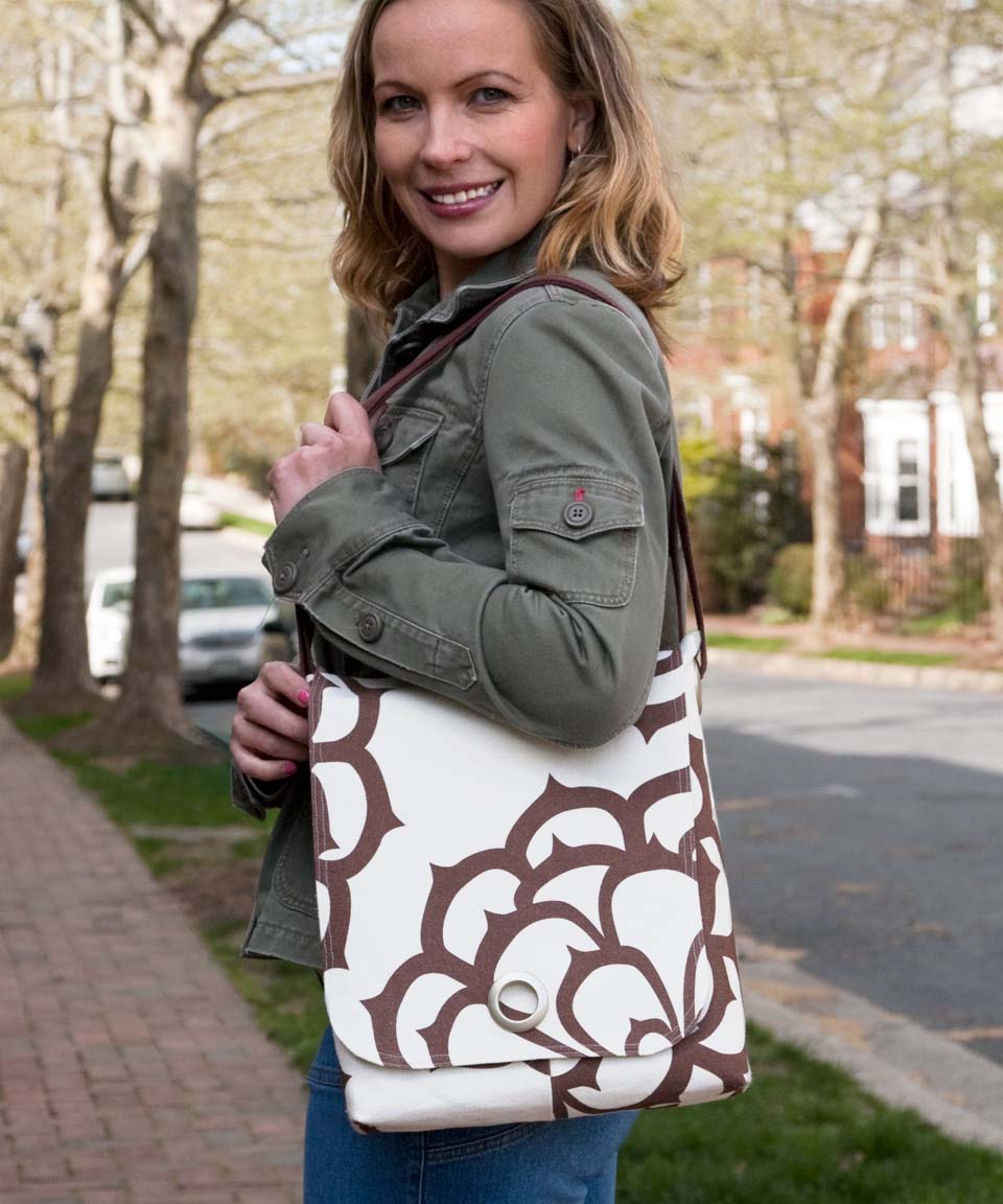 The first of my new Make New or Make Do™ sewing patterns for Spring 2011 is the Alice Book Bag! The Alice Book Bag is a vertical-style messenger bag with plenty of room for a journal, magazines and water bottle with interior pockets for smaller items. The construction of the bag allows you to convert the strap from cross-body to shoulder, simply by pulling the strap through the grommets at the top of the bag. I love this feature! I’m always wanting a bag to do dual duty and often want to change how I’m carrying it throughout the day. I see myself using this bag for all-day outings and travel days. (Regarding the grommets used on this bag…they are super easy to use and simply snap together with your fingers. No special tools are required!)